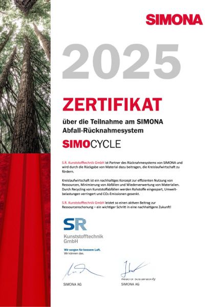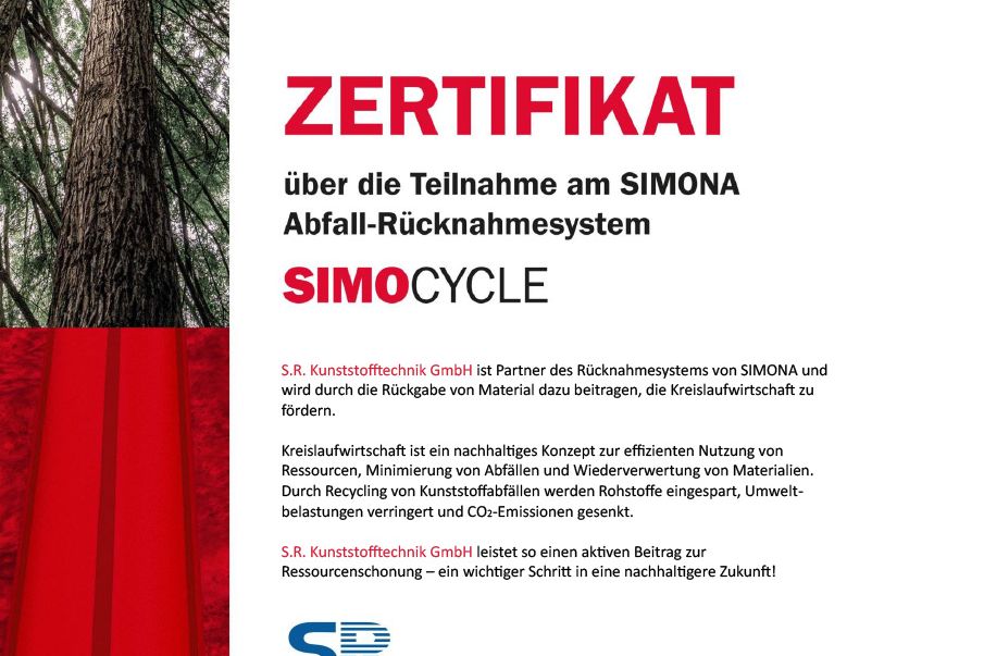 S.R. Kunststofftechnik GmbH ist Partner des Rücknahmesystems von SIMONA und fördert damit die Kreislaufwirtschaft.